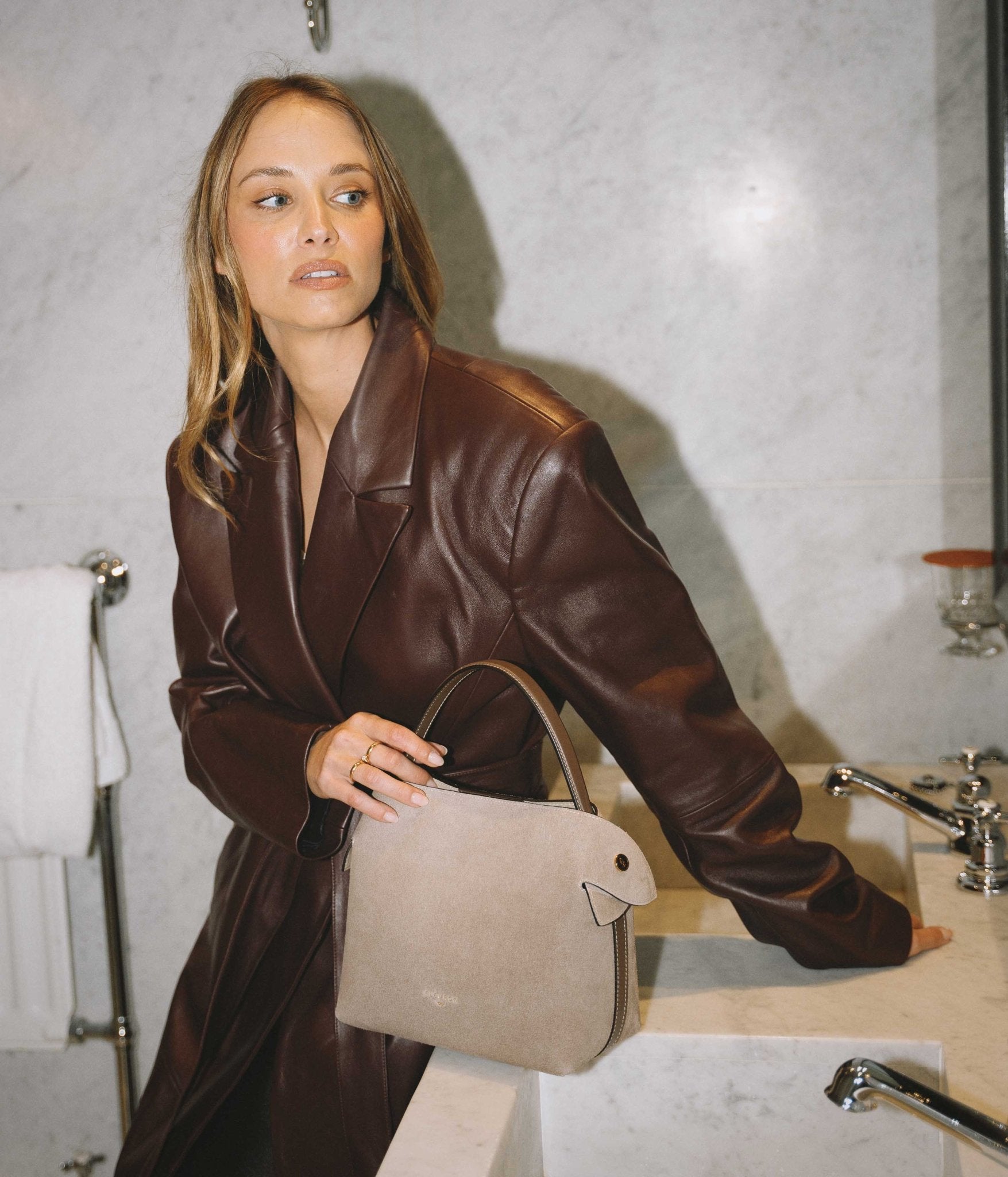 The Medium Swann in Calf Suede Cappuccino, designed in Paris and handcrafted in Italy, stands out with its warm and refined charm. Its Cappuccino shade, soft and enveloping, pairs beautifully with light tones like ecru and beige, as well as deeper hues such as navy or burgundy for an elegant, modern look.