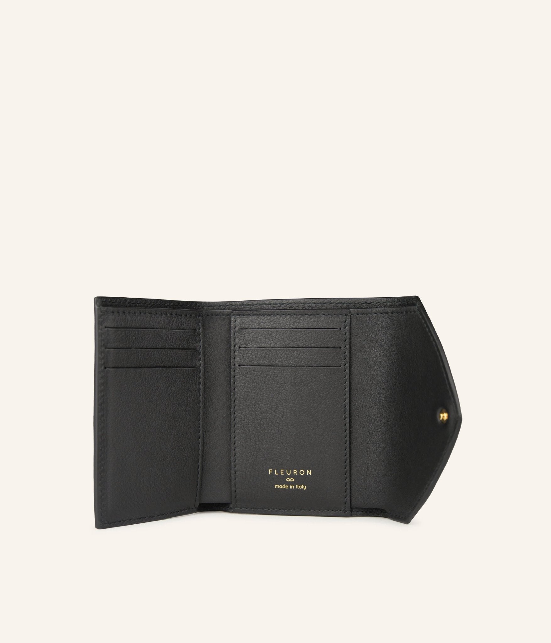 Elegant and timeless, the Via wallet in Noir embodies the essence of refinement. Its deep shade highlights the purity of its lines and suits every occasion. Crafted from high-quality grained calf leather, it combines minimalist design with meticulous attention to detail. Compact and functional, it features thoughtfully arranged compartments for cards and bills while slipping easily into your bag. An Italian creation that reflects Fleuron’s artisanal expertise and understated elegance.