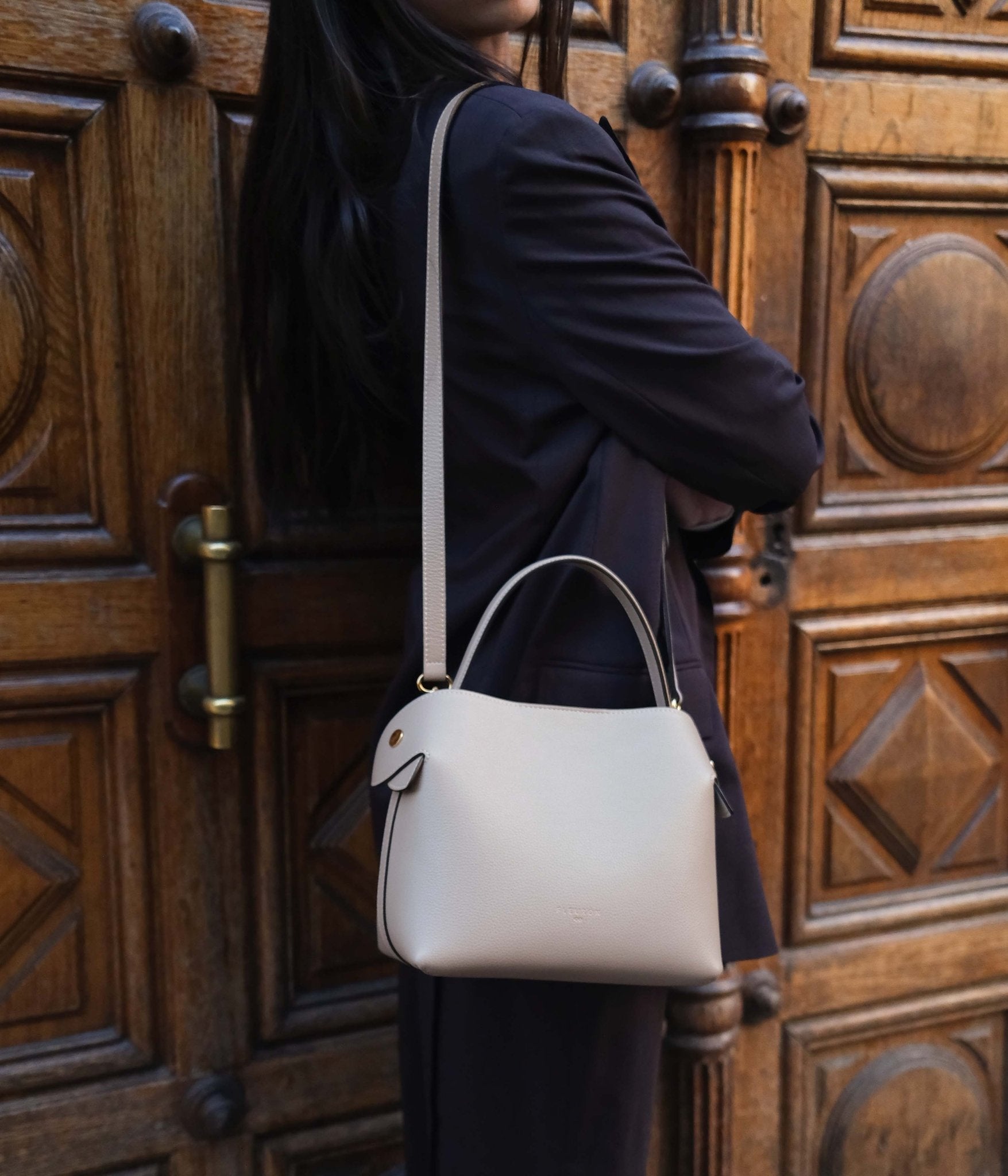 The Medium Swann in Cashmere grained calfskin captivates with its soft, enveloping shade, offering understated elegance in a more generous format. Subtle and refined, this color adapts effortlessly to every silhouette and transitions naturally through the seasons.