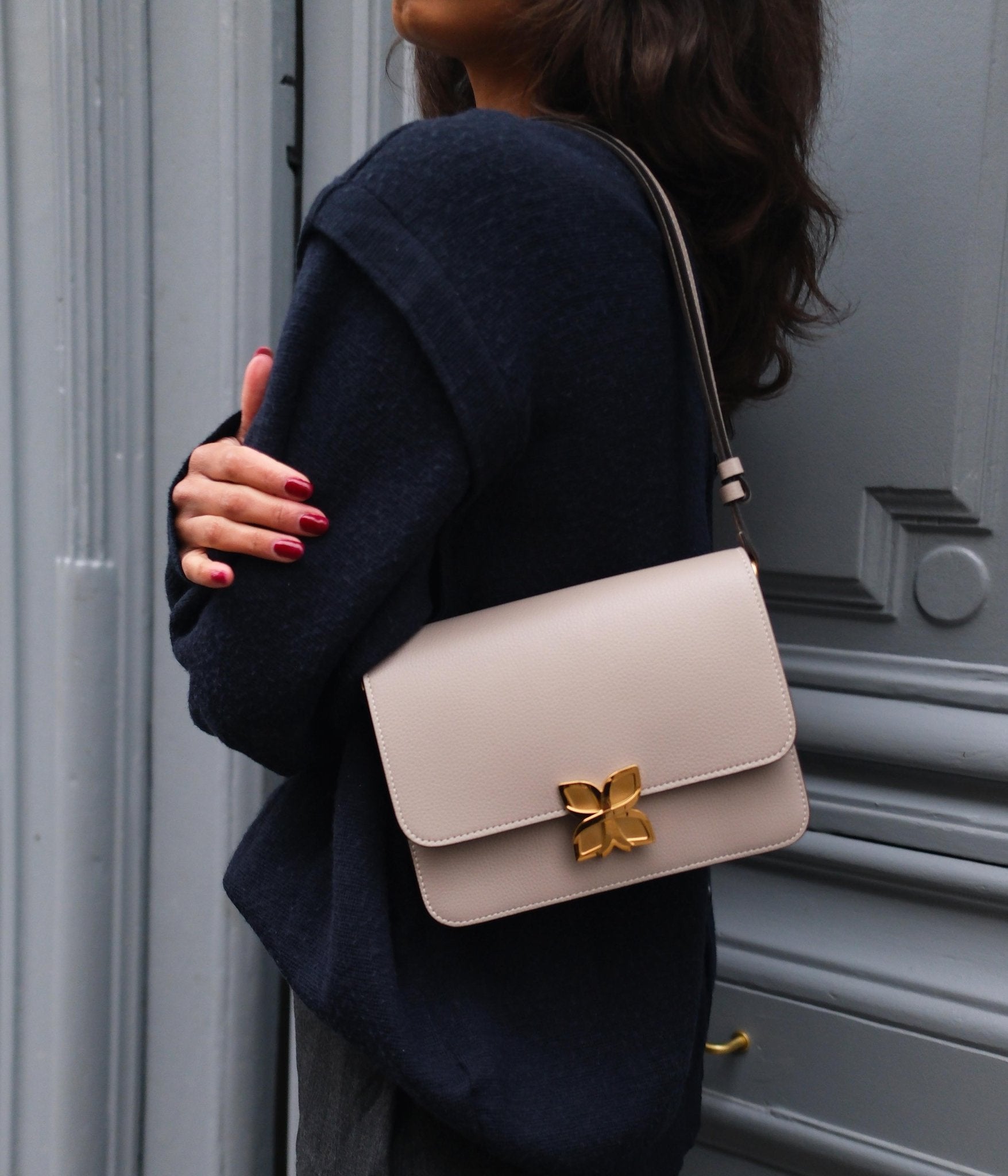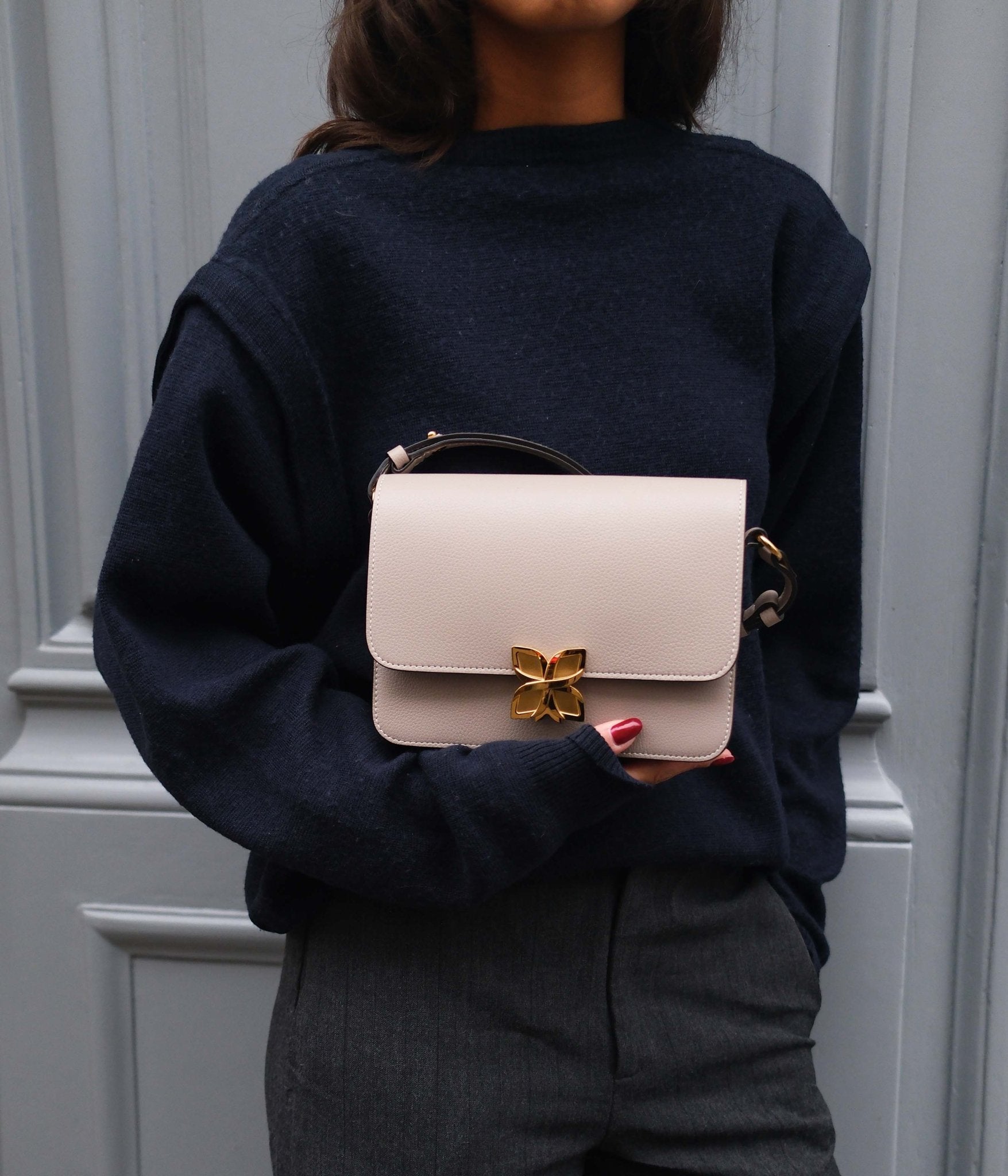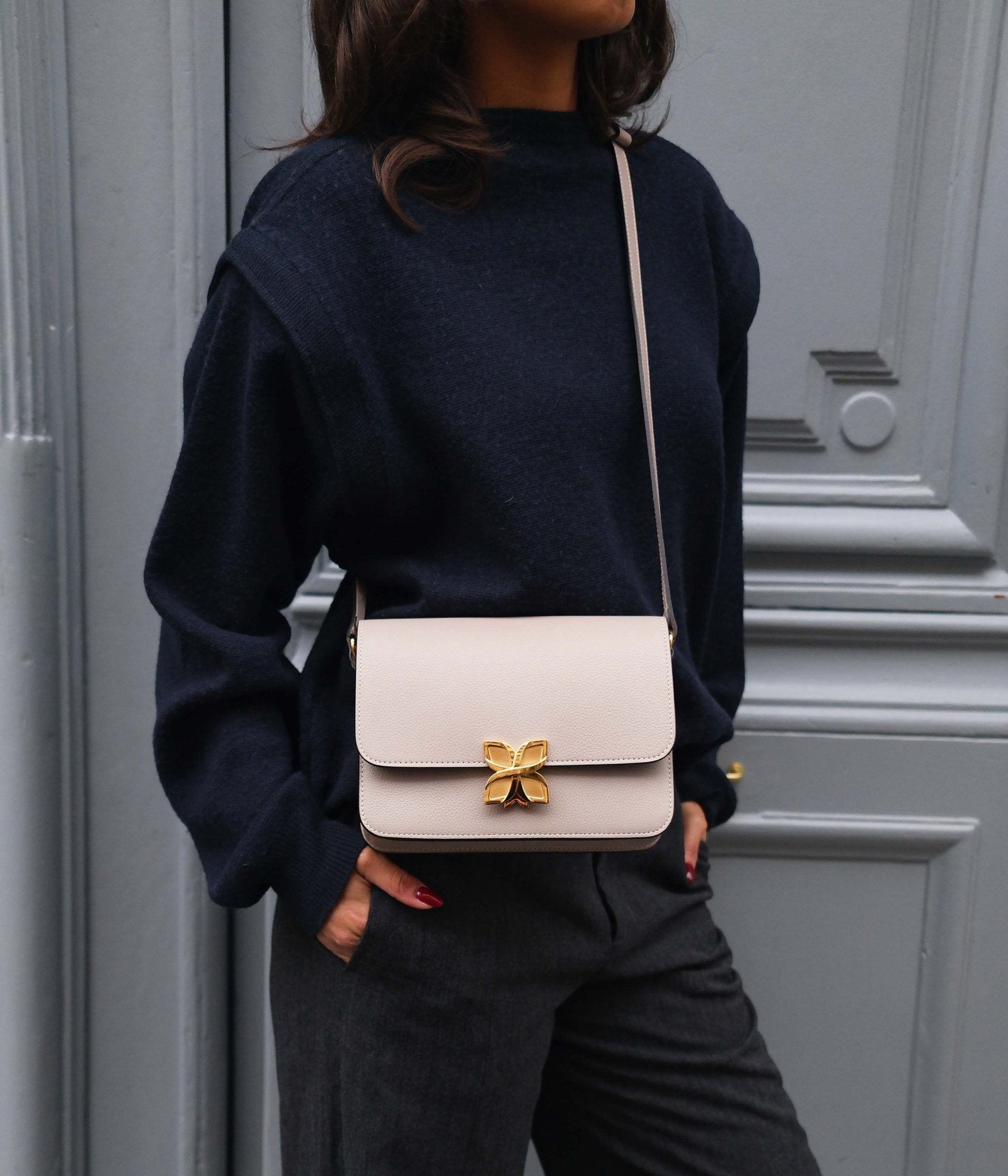 The Cachemire colour, gentle and timeless, pairs effortlessly with any wardrobe: light shades such as ivory, sand, or pearl grey enhance its finesse, while black, burgundy, or midnight blue offer a modern and sophisticated contrast. A versatile hue, designed to accompany your silhouettes throughout the year.