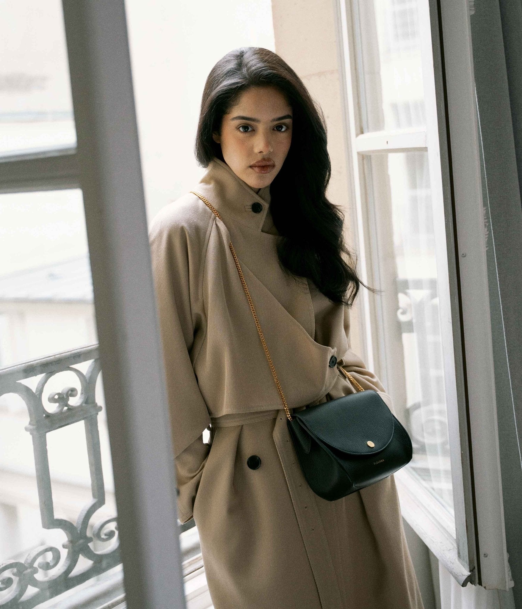 Made from carefully selected grained calf leather, it features a refined texture and impeccable structure. Discreet gold-tone finishes bring a touch of light to its deep, timeless black. This versatile hue pairs seamlessly with a wide range of tones—from off-white to charcoal grey for a sleek monochrome look, or with bolder shades like garnet red, cobalt blue, or emerald green for a striking contrast.
