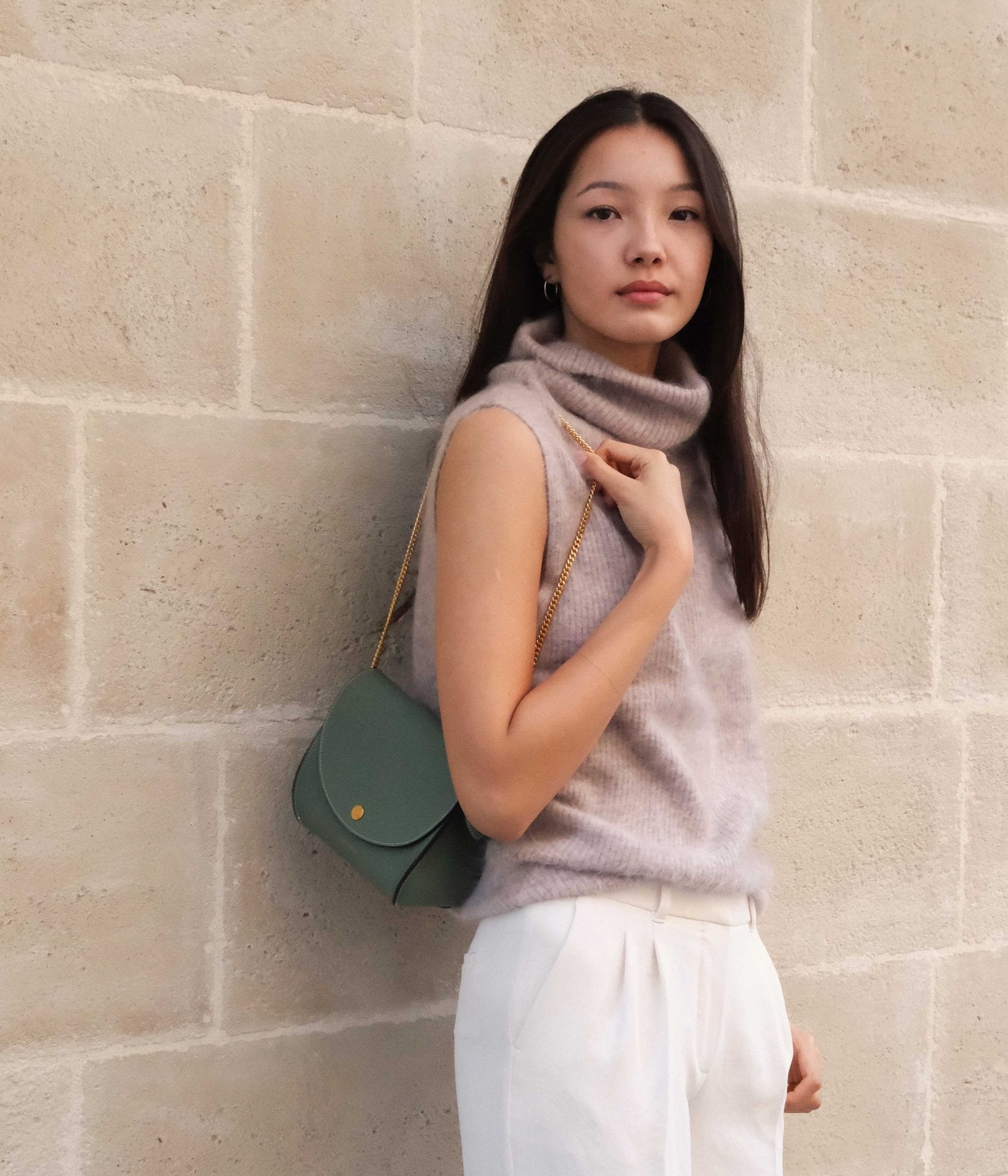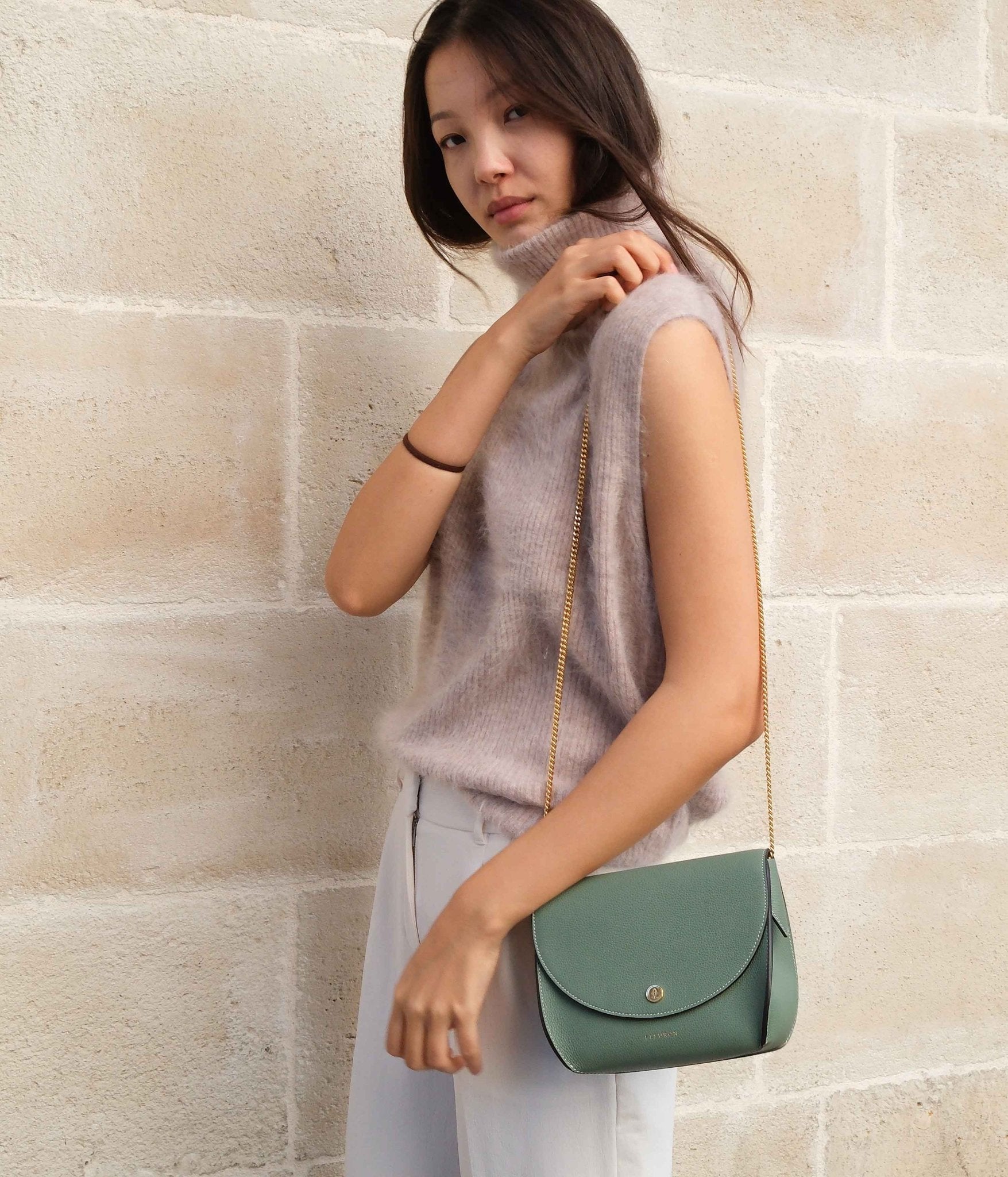 Made from carefully selected grained calf leather, it stands out for its refined texture and excellent durability. Discreet gold-tone details highlight the softness of Almond Green, a gentle and balanced hue that pairs beautifully with light tones like ivory, linen, or sandy beige for a bright, harmonious look. For a more defined contrast, style it with deeper shades like chocolate brown, slate blue, or camel to bring out the subtle richness of this delicate green.