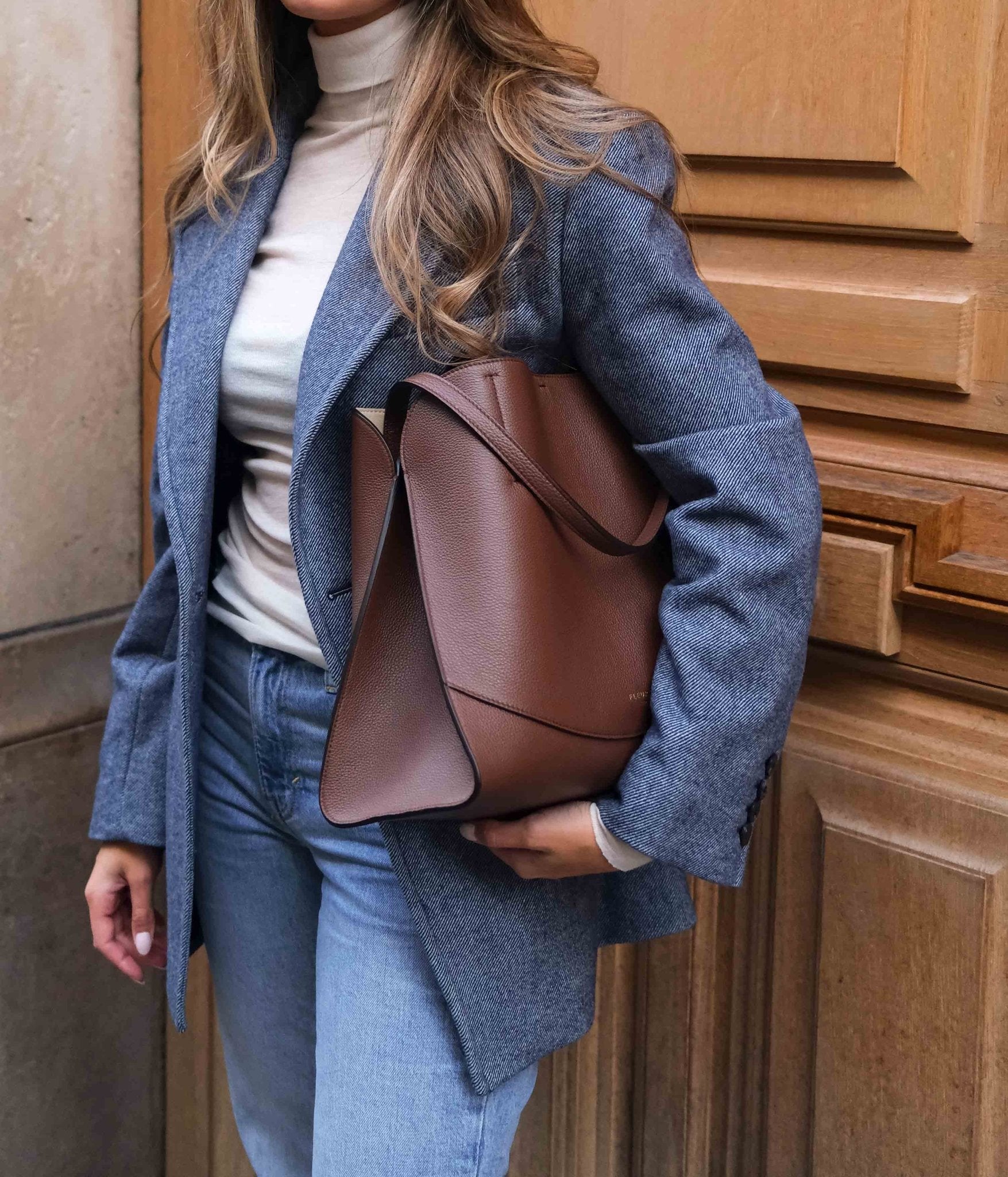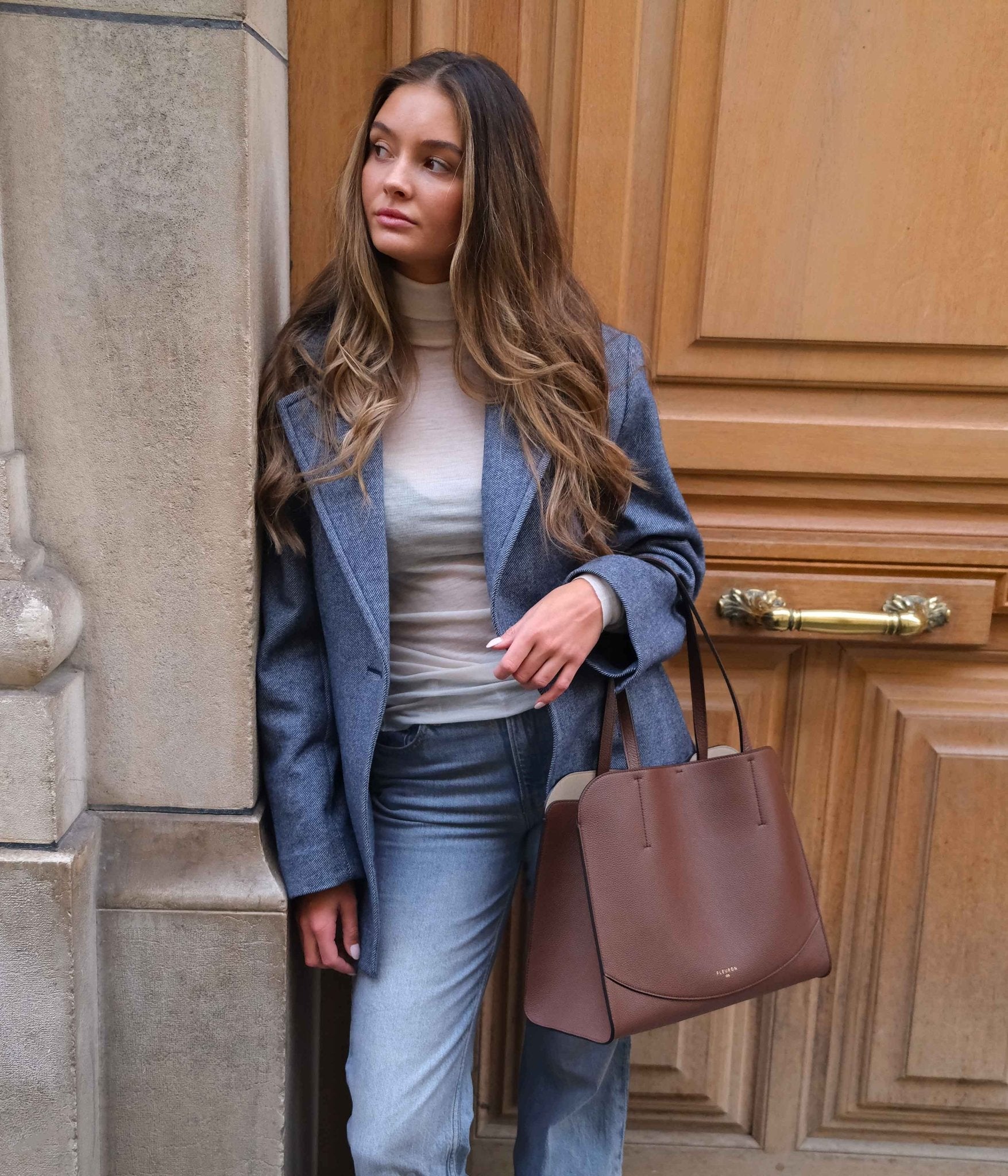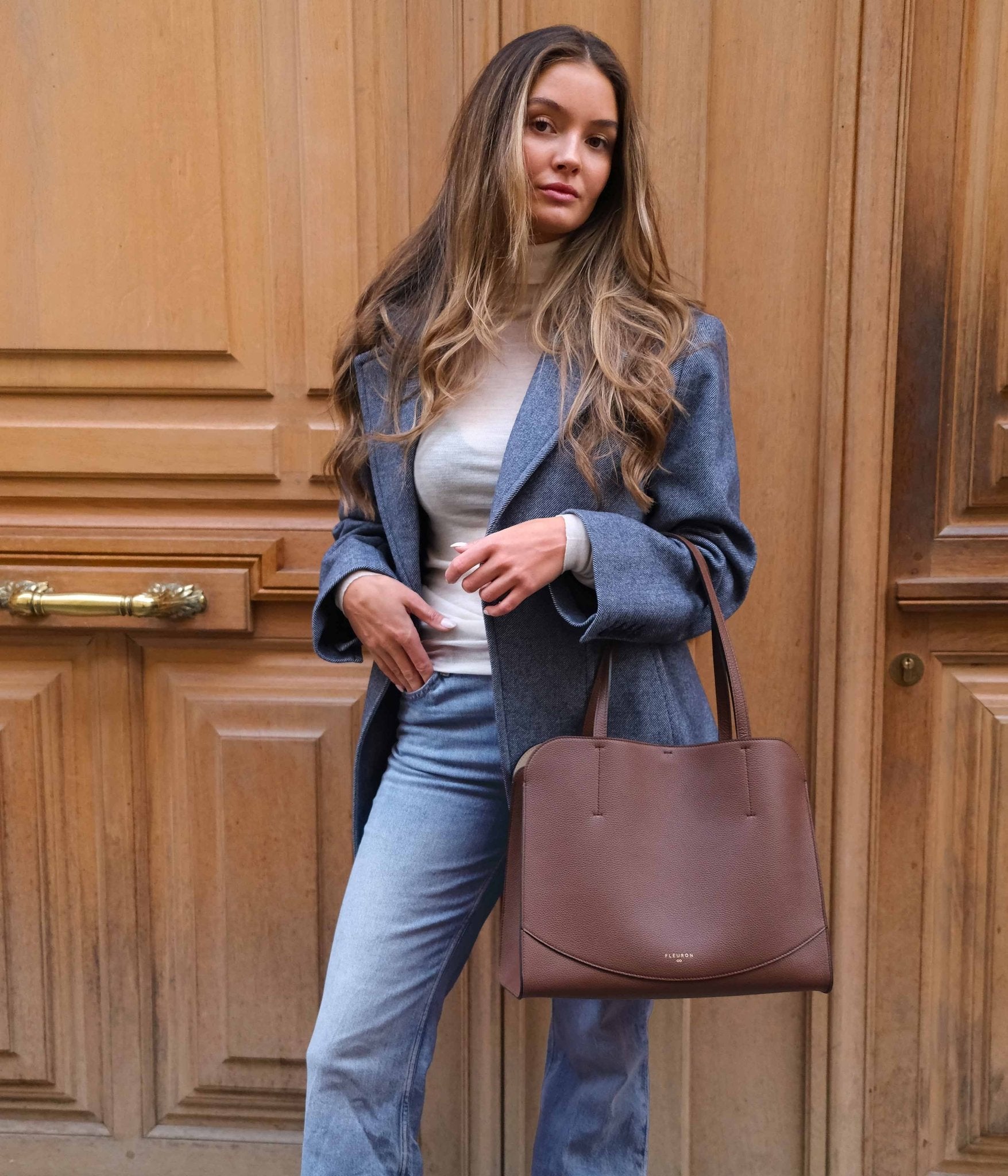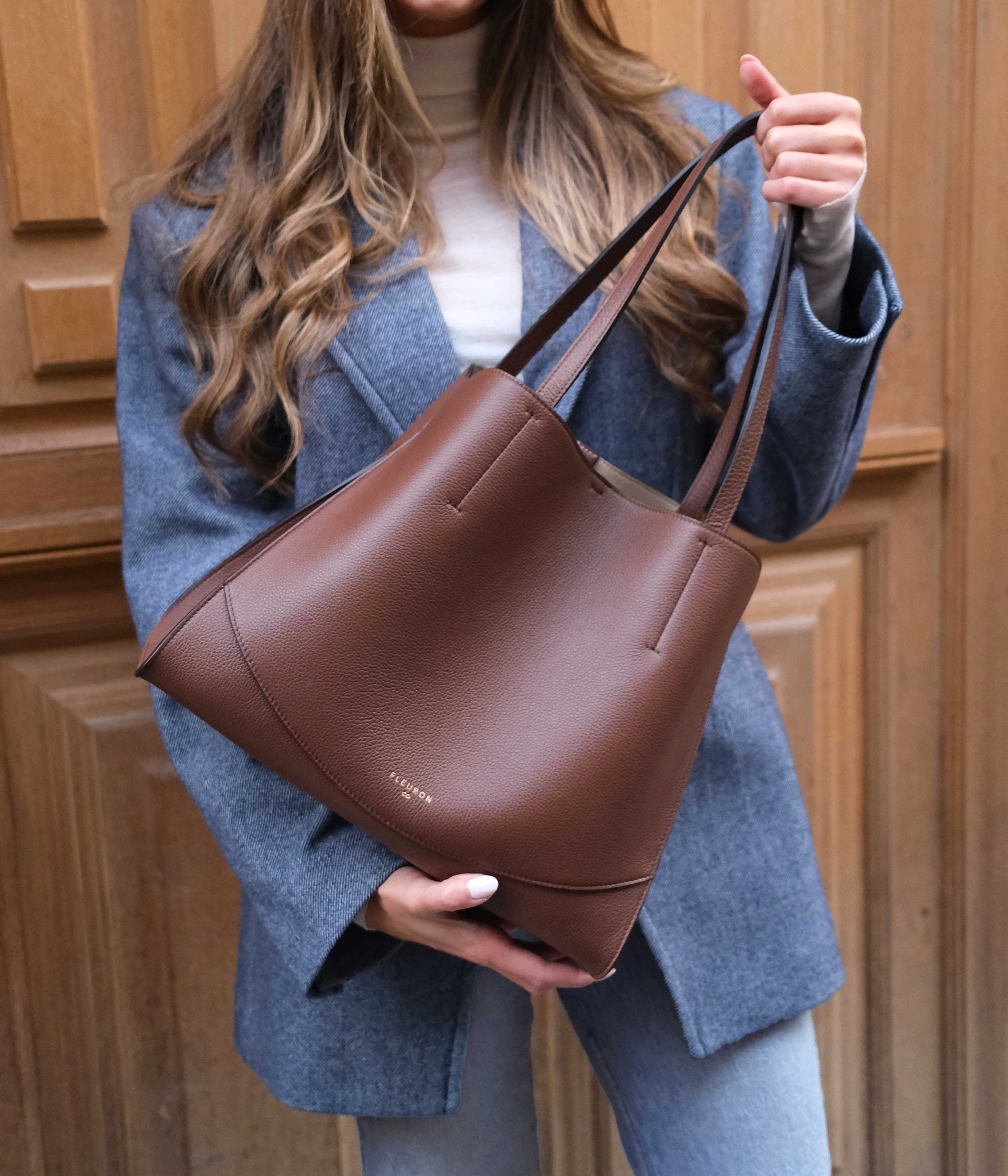 The Medium Oak tote in Tiramisu grained calfskin stands out with its deep, warm brown shade, adding a refined touch of richness to any outfit. Designed to hold A4 documents, it offers the perfect balance of practicality and elegance.